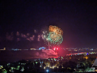 Fireworks have been going off every night for about 5 minutes, but the timing when they start is a guess. 9:30 the first night. 9:45 the next. 10 after that. And tonight it was 9:05. Sandy ran out and caught a few of them. They are included in the photos below. Nice free show!